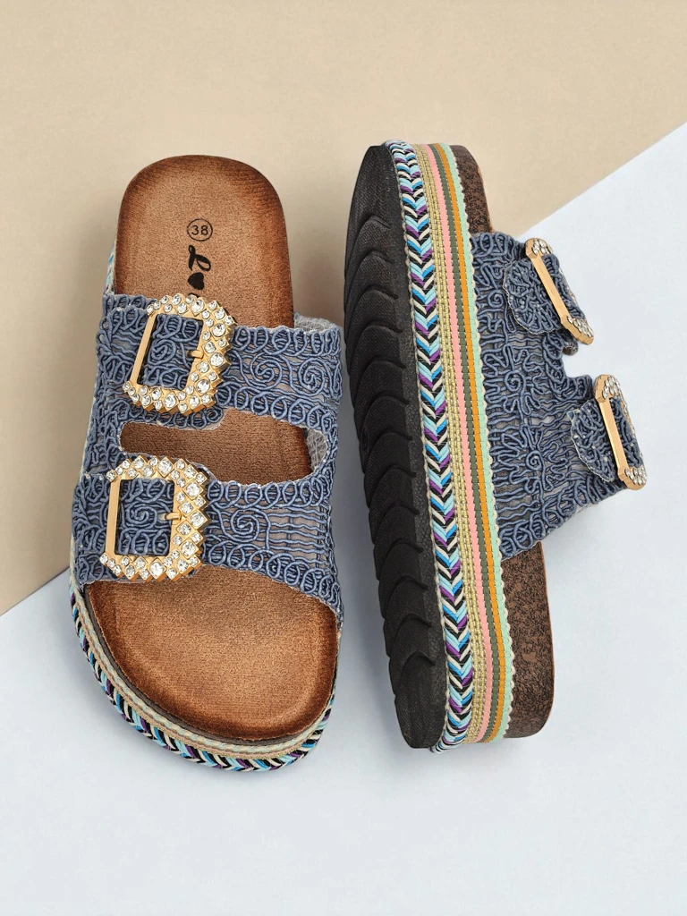 - Стилни чехли на платформа с подметка, наподобяваща корк, с плитки текстилни каишки, украсени с катарами с камъни. Удобна стелка от еко-велур осигурява комфорт, а блестящите детайли добавят елегантност към летните тоалети.