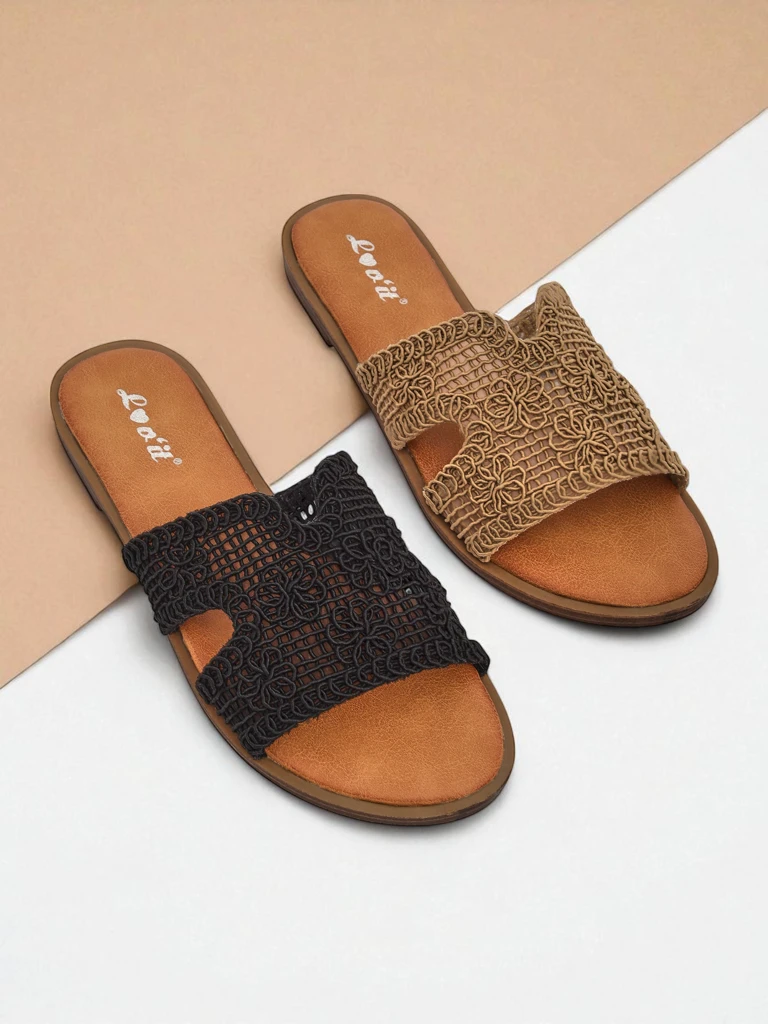 - Дамски сандали от еко кожа на равна подметка с модерен плетен детайл. Удобни и стилни, идеални за лятото и ежедневни разходки. Лекият дизайн осигурява комфорт през целия ден.