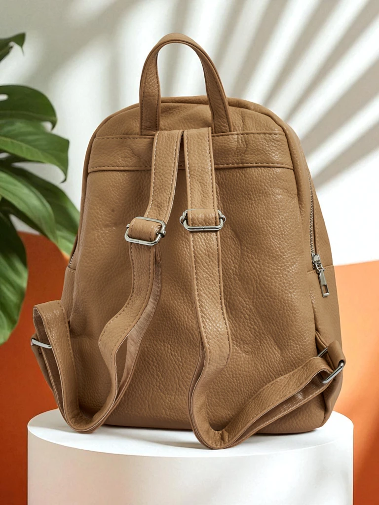 - Стилна, малка раница от еко кожа с едно отделение и два джоба за дребни предмети. Регулируемите презрамки осигуряват удобно прилягане. Идеална за всеки ден - лека, удобна и винаги актуална.