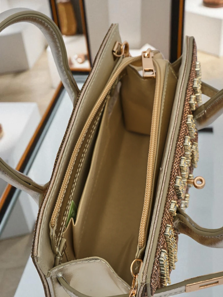 - Елегантна чанта тип клъч с блестящи цирконии, 1 отделение, закопчаваща се с цип. Стилните дръжки и декоративната верижка добавят елегантност. Идеална за специални поводи – блеснете с класа!