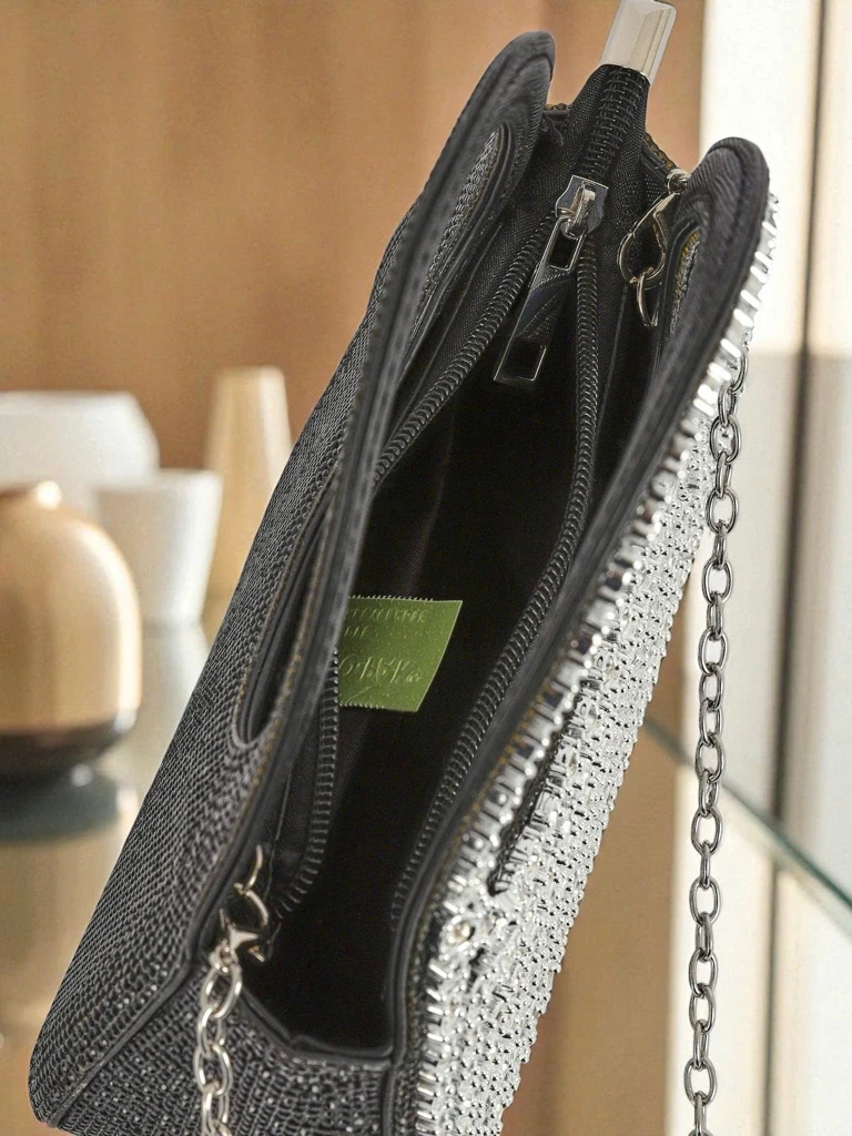 - Елегантна чанта тип плик с блестящи цирконии, 1 отделение, закопчаваща се с цип. Стилните дръжки и декоративната верижка добавят елегантност. Идеална за специални поводи – блеснете с класа!
