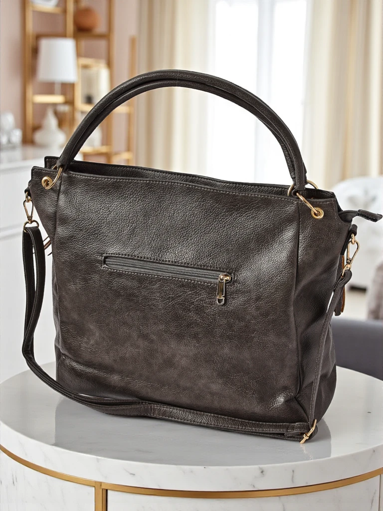 Чанта Artemida Vera е универсален избор за съвременните жени, които търсят комбинация от елегантност, функционалност и грижа за околната среда. Изработена е от висококачествена екологична кожа с гладка, приятна на допир текстура. Този материал се характеризира с висока издръжливост, устойчивост на механични повреди и лесна поддръжка, което прави чантата изключително практична за всеки ден. Екологичната кожа, използвана за производството, е преминала тестове за качество и отговаря на високи екологични стандарти, подкрепяйки съзнателния избор при пазаруване. Вътрешността на чантата е внимателно проектирана – ще намерите просторно основно отделение, отделни джобове за дребни предмети и безопасен джоб с цип, който предпазва най-ценните предмети. Благодарение на ширината от 45 см, височината от 30 см и дълбочината от 10 см, този модел лесно побира лаптоп, документи или козметична чантичка. Предимства на чанта Artemida Vera: - Модерен, минималистичен дизайн в модерен сив нюанс. - Удобни дръжки и подвижна презрамка позволяват да се носи по два начина. - Ципът осигурява безопасност на съдържанието. - Внимателно завършените детайли и декоративните пискюли добавят лекота и женствен стил. Как да комбинирате? 1. Бизнес стил: комбинирайте Artemida Vera с бяла риза, панталон с костюм и токчета – идеално решение за офиса. 2. Ежедневно за града: комбинирайте с дънки тип mom fit, oversized пуловер и маратонки, а вашата визия ще придобие градски характер. 3. За специални поводи: чантата красиво ще допълни класическа малка черна рокля или пастелна рокля и елегантни балеринки. Поддръжка и почистване: За да запазите страхотния вид на чантата, почиствайте я с мека, влажна кърпа и я съхранявайте на сухо място, далеч от пряка слънчева светлина. Препоръчва се също така използването на специален препарат за грижа за екологична кожа. Тенденции на сезона: Сивото и минималистичните форми са абсолютен must-have на най-новите колекции. Чанта Artemida Vera се вписва в тенденцията за еко и съзнателна мода – лесно ще създадете с нея непреходни, модерни визии.