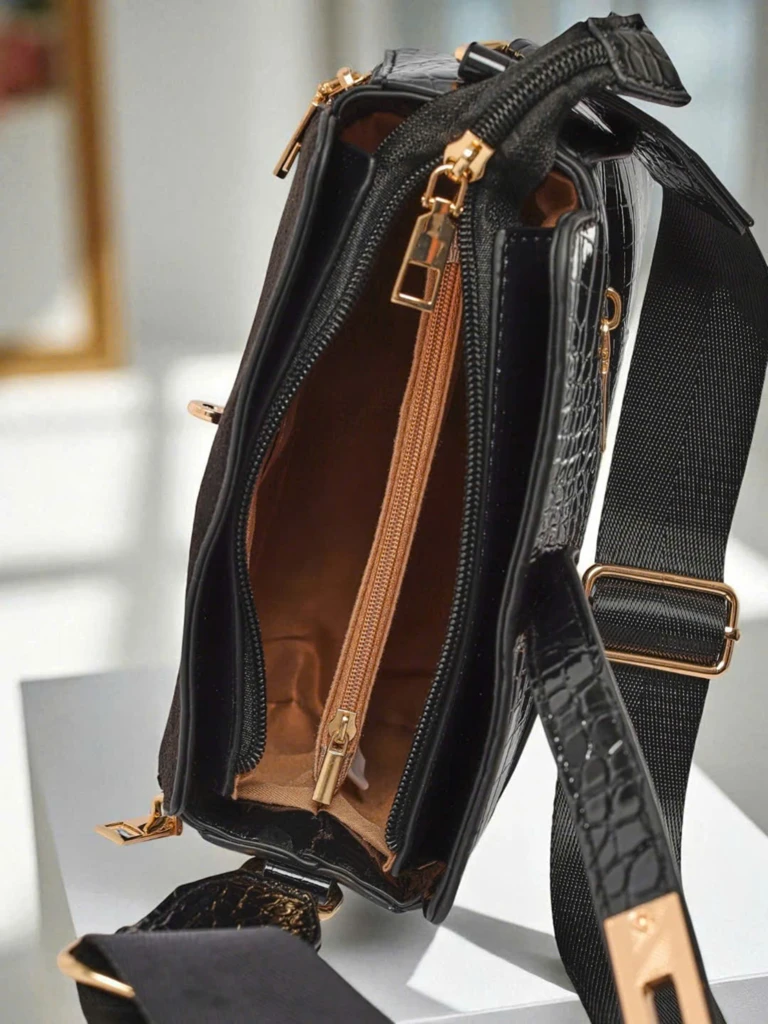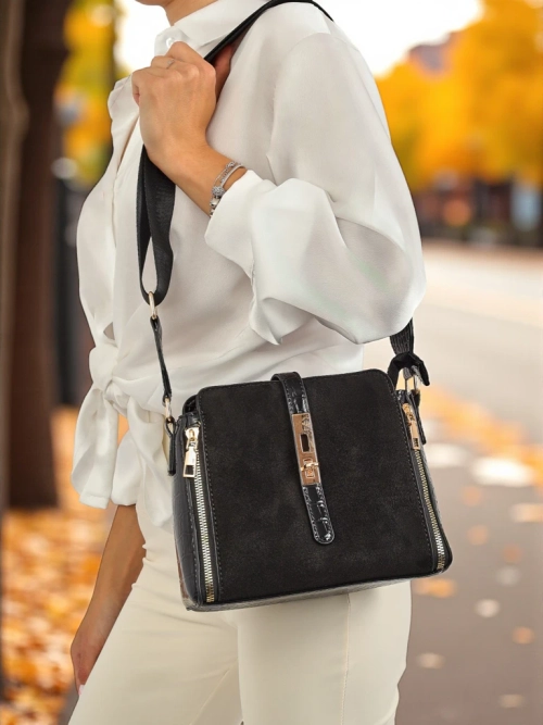Открийте уникалната чанта Callista Black, която съчетава класика и модерен шик. Изработена от висококачествена екологична лачена кожа, тя осигурява ефектен външен вид, издръжливост и устойчивост на влага и леки драскотини. Производственият процес се основава на използването на екологично чисти материали – еко кожата е алтернатива на естествената кожа, която не изисква използването на химикали, вредни за планетата, което се потвърждава от международните стандарти за качество. Чантата е с компактна, малка форма (размери: 22x20x9 cm), която й придава универсален характер: не побира формат А4, но лесно можете да съхранявате в нея портфейл, телефон, козметика и други необходими дреболии. Комбинацията от цип и магнитно закопчаване гарантира безопасност, а здравата, регулируема презрамка позволява удобно носене на рамо или през тялото. Най-важните предимства: - Универсалното черно подхожда на всяка визия и подчертава елегантния стил. - Меката, но същевременно издръжлива еко лачена кожа не губи външния си вид въпреки ежедневната употреба. - Луксозните покрития и златните детайли добавят моден характер. Вдъхновения и стилизации: 1. Business casual: Носете чантата с класическа бяла риза и панталон тип цигара – ще подчертаете своя професионализъм с нотка женственост. 2. Градски стил: Отлично се комбинира с дънки тип mom fit, пуловер в неутрален цвят и маратонки. 3. Вечерно излизане: Съчетайте с черна рокля или гащеризон, златни бижута и обувки на висок ток – чанта Callista ще добави шик към всяка стилизация. Консервация и грижа: За да може чантата да ви служи възможно най-дълго, препоръчваме да я почиствате с влажна кърпа без препарати, да избягвате прекомерното излагане на силна слънчева светлина и да я съхранявате в защитен калъф. Еко кожата не изисква омазняване – веднъж на няколко седмици е добре да използвате специализиран препарат за почистване на еко кожа. Тенденции 2024: Модата на аксесоари от екологични материали не губи своята популярност! Малките, черни чанти от еко кожа царуват на световните модни подиуми, представлявайки практично и стилно допълнение към всеки гардероб. Callista Black е избор както за минималистки, така и за любителки на оригинални детайли.