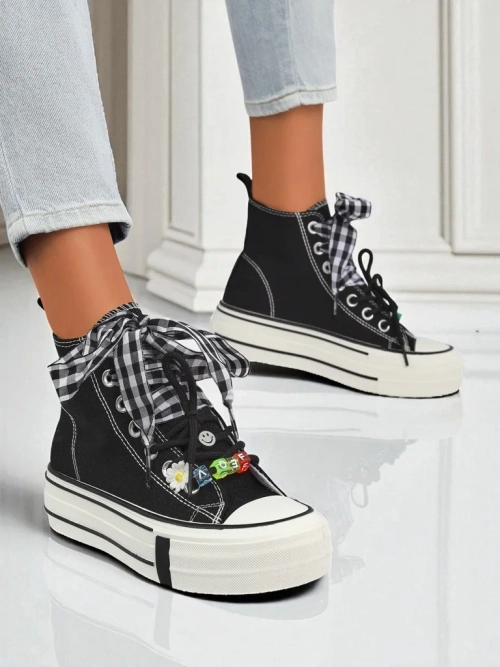 - Модерни маратонки от плат с по-дебела подметка. Декорирани с цветни връзки и мъниста. Удобни, леки и стилни – идеални за градски визии и ежедневно носене. Комфорт и тренд в една стъпка.
