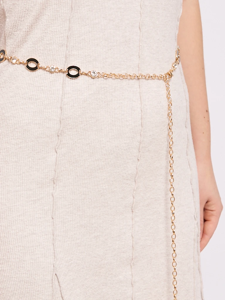 - Модерен дамски колан с верижка, изработен от метал и закопчаващ се с кукичка с ширина 1 см. Ще бъде атрактивно допълнение към много вечерни визии.