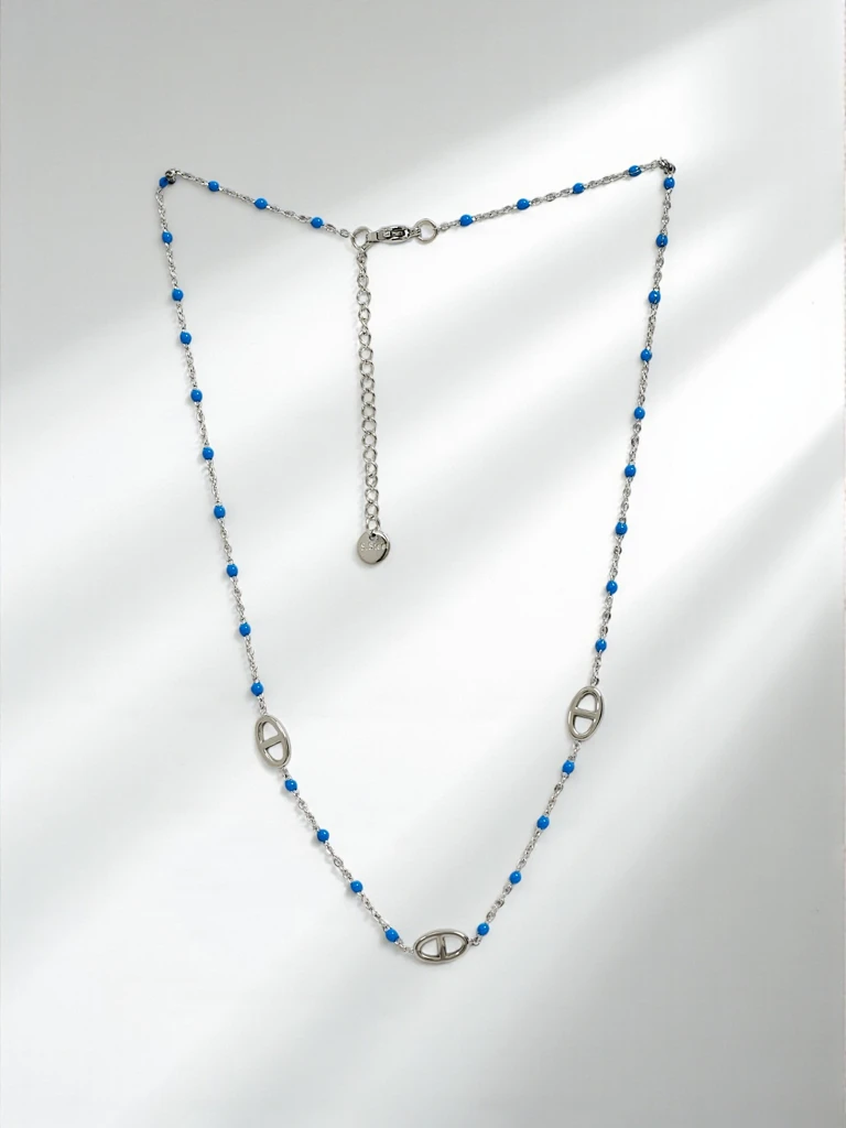 - Деликатно колие от неръждаема стомана със сини мъниста, стилна декорация за всеки повод.