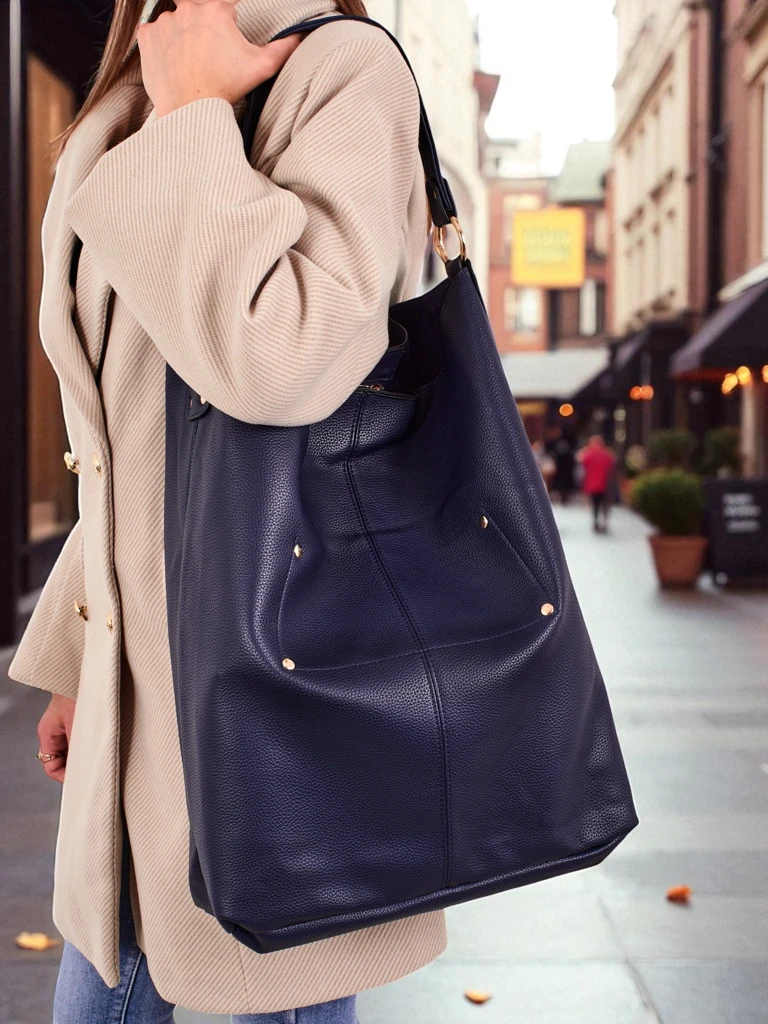 Materiał i technologia: Torebka wykonana z wysokiej jakości skóry ekologicznej (PU) o ziarnistej fakturze, powlekanej poliuretanem dla zwiększonej odporności na ścieranie. Wykończenia to metalowe okucia w ciepłym, złotawym odcieniu oraz solidny zamek błyskawiczny. Wnętrze podszyte jest trwałą tkaniną poliestrową, a brzegi wykończono precyzyjnym przeszyciem, które przedłuża żywotność produktu. Produkt jest nowy i starannie skrojony w procesie konfekcjonowania z dbałością o detale.Korzyści i odczucia podczas użytkowania: Torebka jest pojemna (wys. 46 cm, szer. 45 cm, głęb. 13 cm) i swobodnie mieści format A4 — idealna na dokumenty, tablet czy książki. Miękka, lecz strukturalna ekoskóra daje przyjemne wrażenie dotykowe i elegancki wygląd bez efektu przeładowania. Regulowany, odpinany pasek oraz krótsze uchwyty (wys. 18 cm) pozwalają nosić model na ramieniu, w ręce lub jako listonoszkę. Całkowita waga ok. 1,73 kg świadczy o solidnej konstrukcji i trwałych materiałach.Miejsca i styl noszenia (korzystne scenariusze): torebka sprawdzi się w pracy, na spotkaniach, podczas zakupów czy weekendowych wyjazdów. Minimalistyczna linia i uniwersalny brąz pasują do wielu stylizacji.Miksowanie i propozycje stylizacji:- Casual codzienny: klasyczne jeansy, biały t-shirt i sneakersy — torebka doda stylizacji elegancji i pojemności.- Do biura: slim spodnie, koszula i marynarka — brązowy akcent podkreśli stonowany, profesjonalny look.- Weekend / boho: sukienka maxi, botki i kapelusz — torebka uzupełni warstwową, swobodną estetykę.- Wieczorne wyjście: prosta sukienka, płaszcz oversize — model wniesie ciepły, luksusowy akcent.Pielęgnacja i przechowywanie: Czyścić miękką, wilgotną szmatką z delikatnym mydłem; unikać silnych rozpuszczalników i wybielaczy. Suszyć w temperaturze pokojowej, z dala od źródeł ciepła. Dla zachowania kształtu przechowywać wypełnioną papierem lub tkaniną i w worku ochronnym. Do impregnacji używać preparatów przeznaczonych do ekoskóry.Aktualne trendy: Neutralne odcienie i duże, funkcjonalne torby są wciąż na topie — łączą wygodę z elegancją i wpisują się w kierunek zrównoważonej mody, która preferuje ponadczasowe, wielozadaniowe akcesoria.