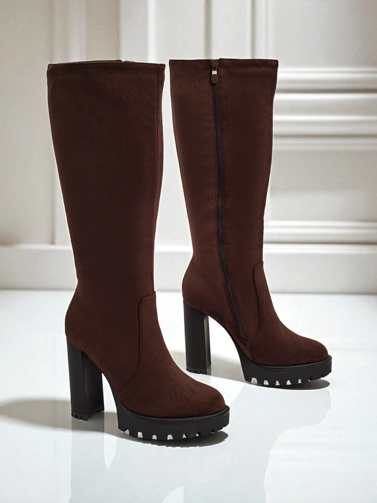 - Стилни дамски ботуши до коляното на ток. Горната част е изработена от еко велур, с топъл пух отвътре. Моделът се закопчава с цип. Идеални за ежедневни есенни тоалети!