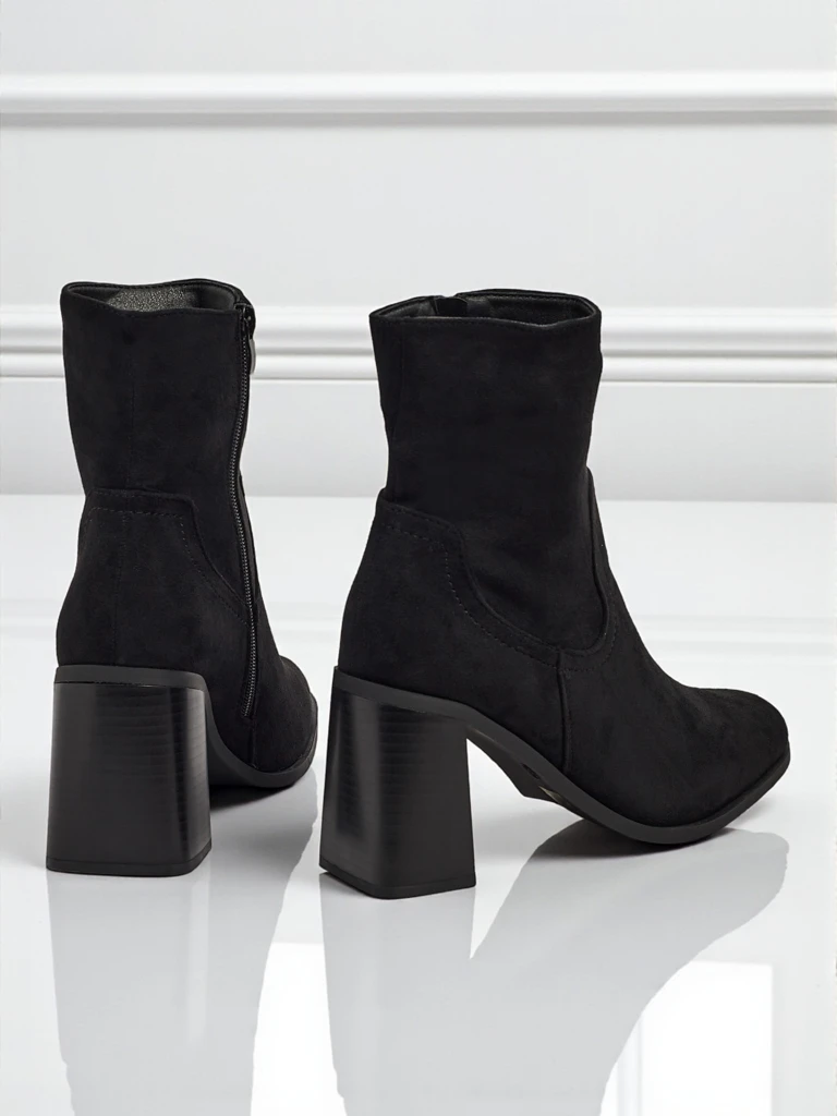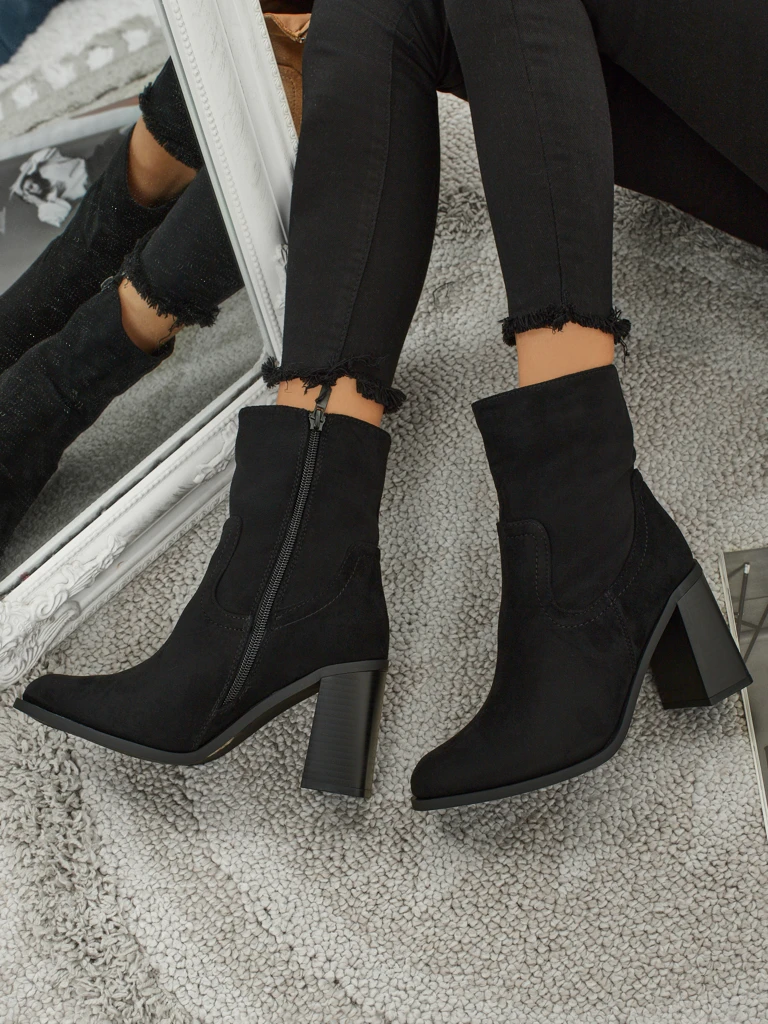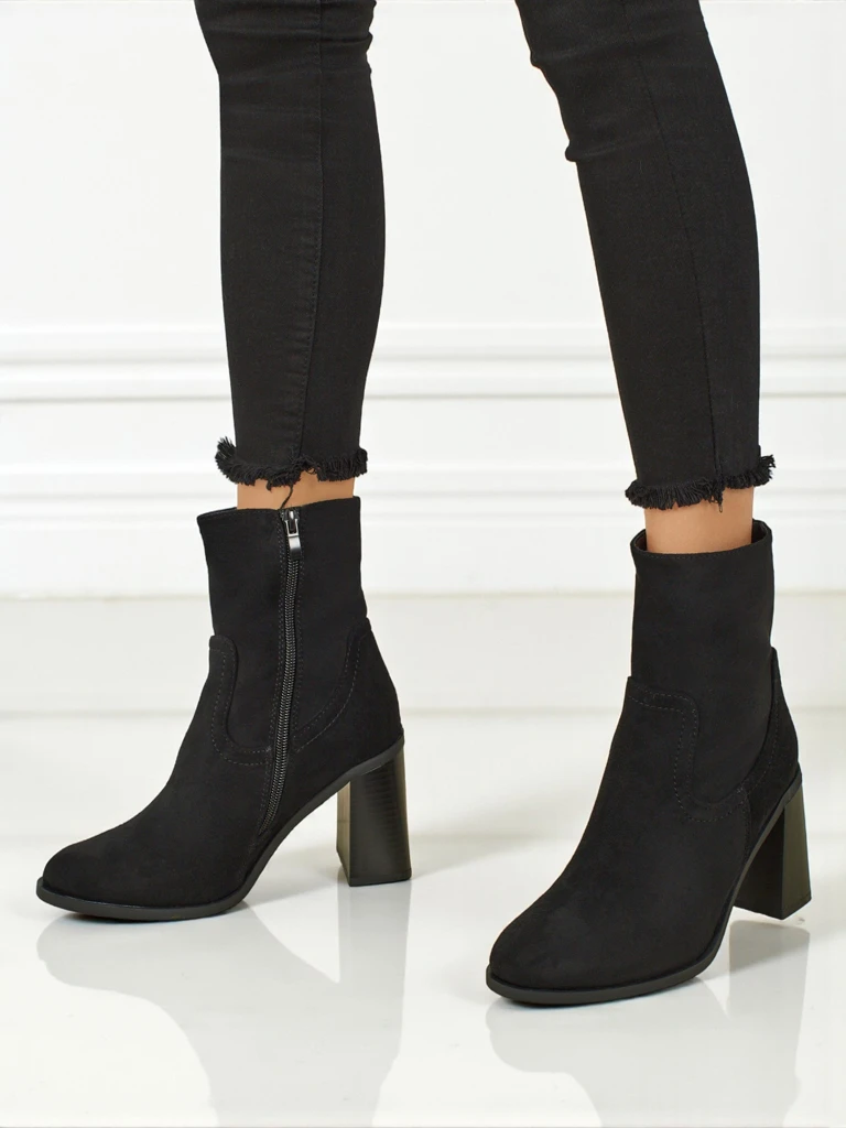 - Удобни боти на ток, изработени от еко велур. Моделът се закопчава с цип. Идеален избор за есента!
