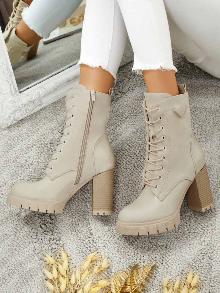 - Удобни боти на ток, изработени от еко велур и екологична кожа. Моделът е с връзки и цип. Идеален избор за есента!