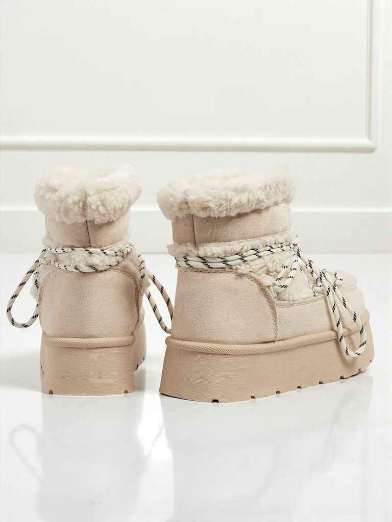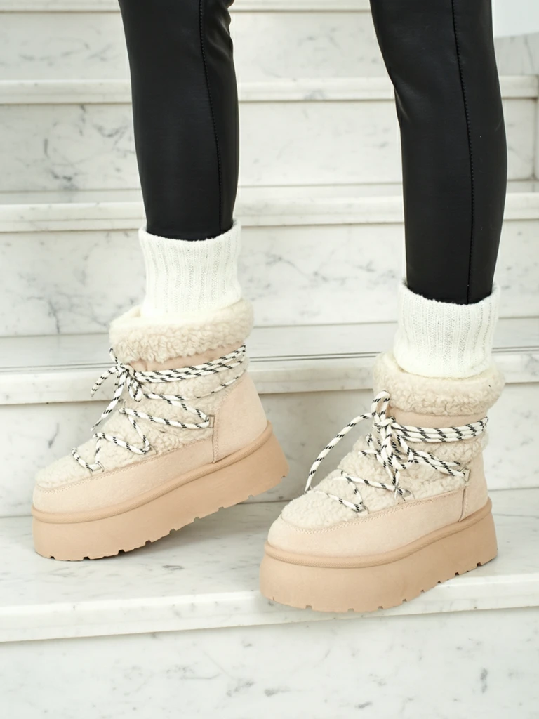 - Страхотни дамски зимни ботуши тип снегоходки с по-дебела подметка. Горната част е изработена от екологична велурена кожа и материал, наподобяващ кожух, а вътрешността е изолирана с пух. Идеална основа за зимата!