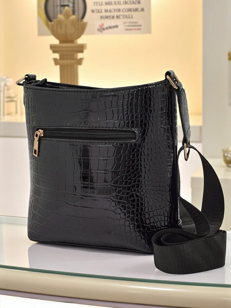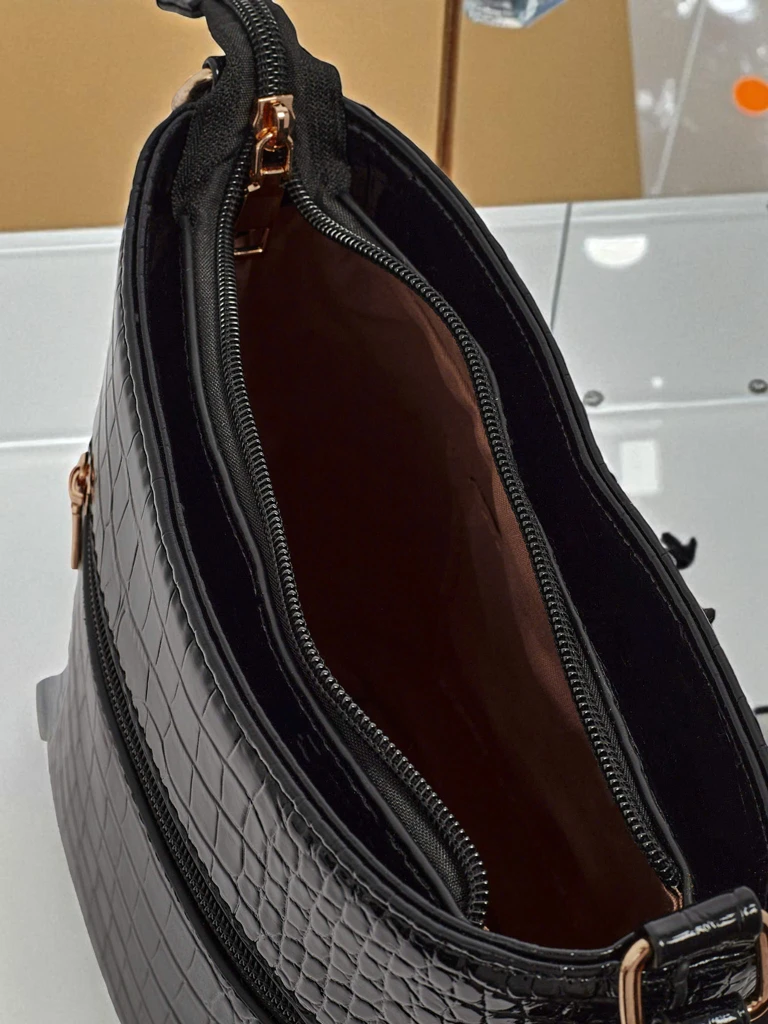 - Квадратна чанта от лакирана еко кожа с щампа. 1 отделение, 3 джобчета, цип, магнит и регулируема презрамка. Стил и функционалност в перфектно изпълнение.