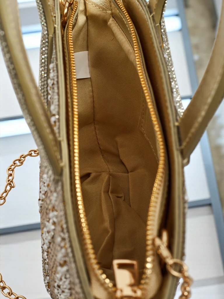 - Ослепителна малка дамска чанта с цирконии. Закопчава се с цип, с дръжки и откачаща се верижка. Идеална за вечерни излизания - малка, ефектна и пълна с блясък!