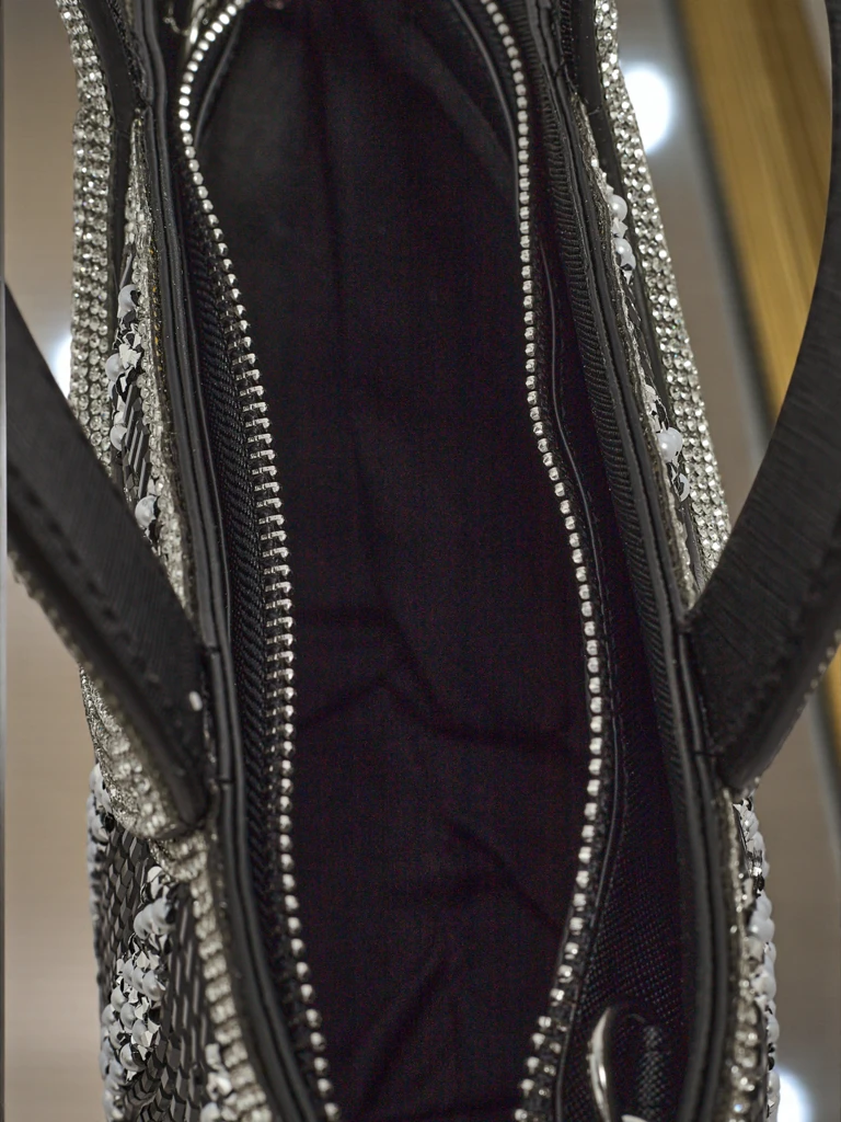 - Ослепителна малка дамска чанта с цирконии. Закопчава се с цип, с дръжки и откачаща се верижка. Идеална за вечерни излизания - малка, ефектна и пълна с блясък!
