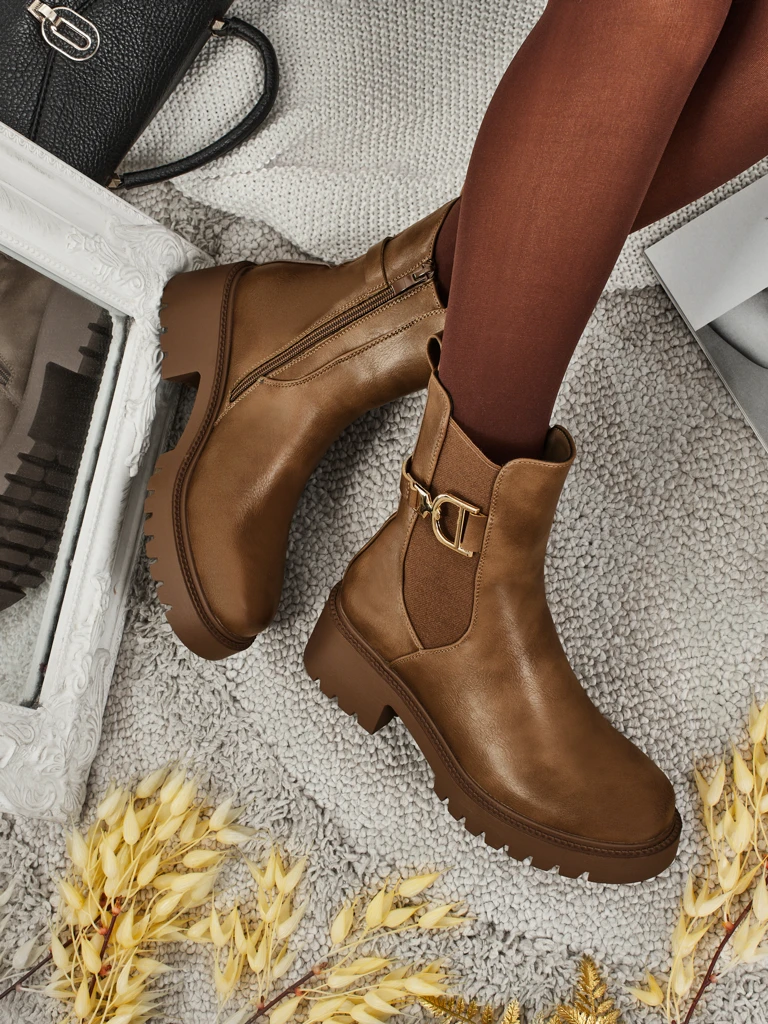 • Дамски боти от еко кожа, със закопчаване с цип и еластична вложка отстрани. Моделът е с по-дебела подметка. Има текстилна стелка. Удобни и стилни, идеални за есента!