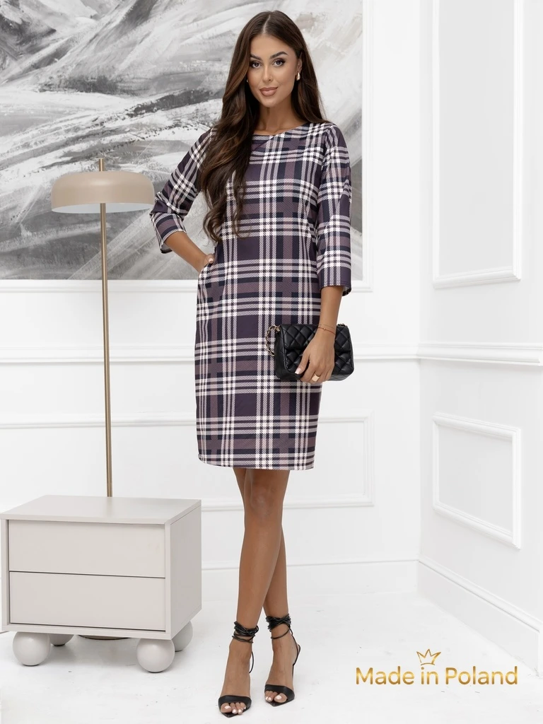 - Дамска мини рокля. Модел с 3/4 ръкави, кръгло деколте. Декорирана с кариран модел, има джобове. Задължителна за вашия гардероб!
