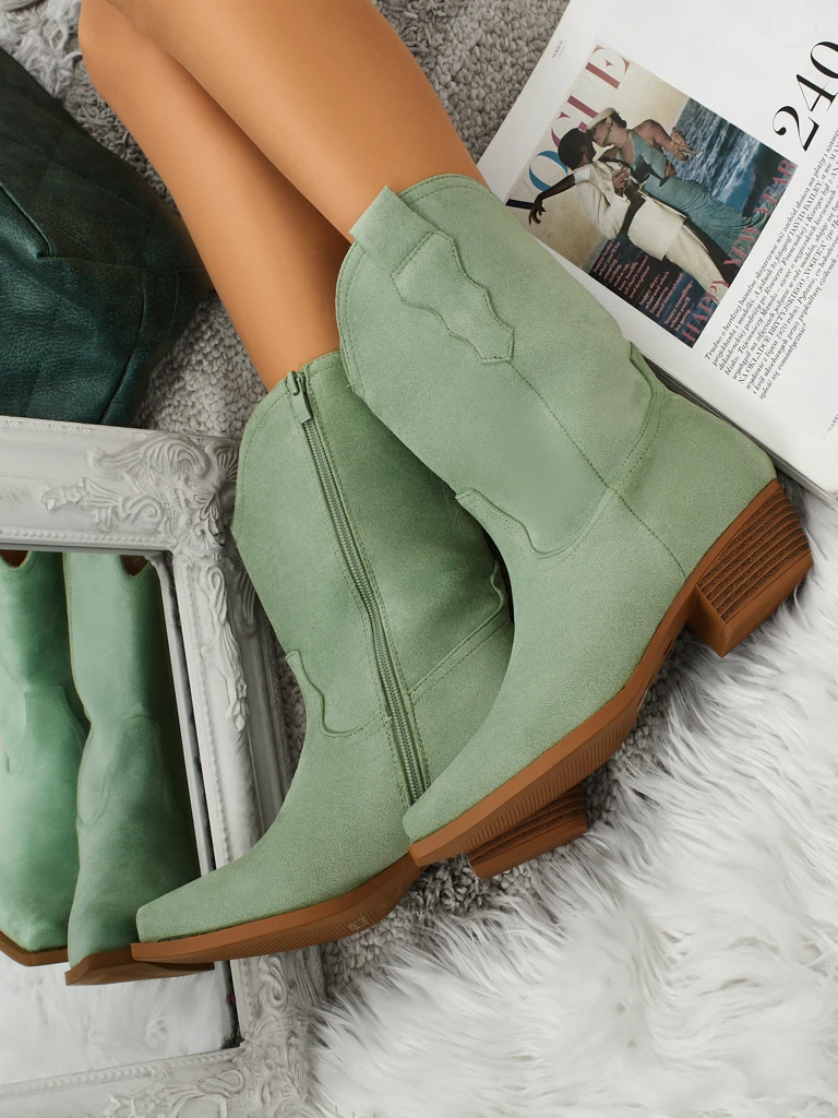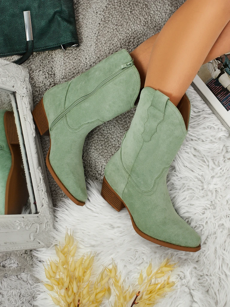 • Боти до глезена в стил каубойски ботуши на плосък ток, изработени от екологична велурена кожа. Текстилна стелка, обувките се закопчават с цип. Подходящи за много дамски стилове!