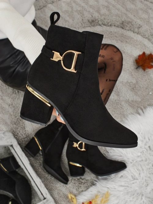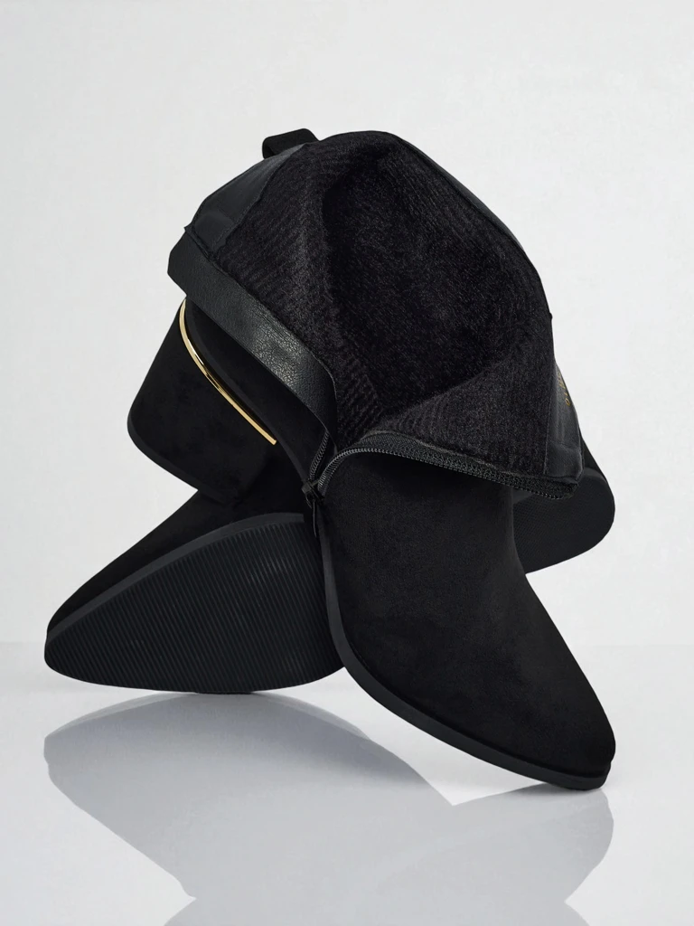 - Удобни боти на ток, изработени от еко велур. Моделът се закопчава с цип. Моделът е леко подплатен с пухкава подплата и има златна декорация отстрани на горната част. Перфектен избор за есента!
