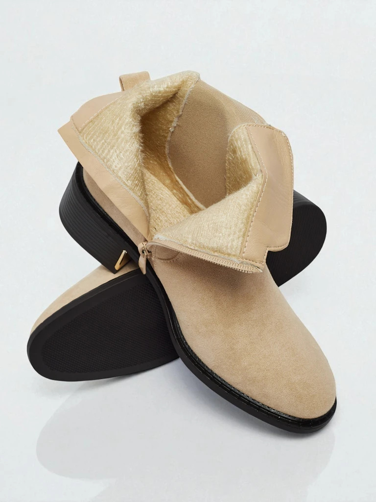 - Дамски боти с цип. Моделът е изработен от екологична кожа, с равна подметка. Има подплата, наподобяваща козина. Декорирани със златни катарами. Удобни и стилни, идеални за есента!
