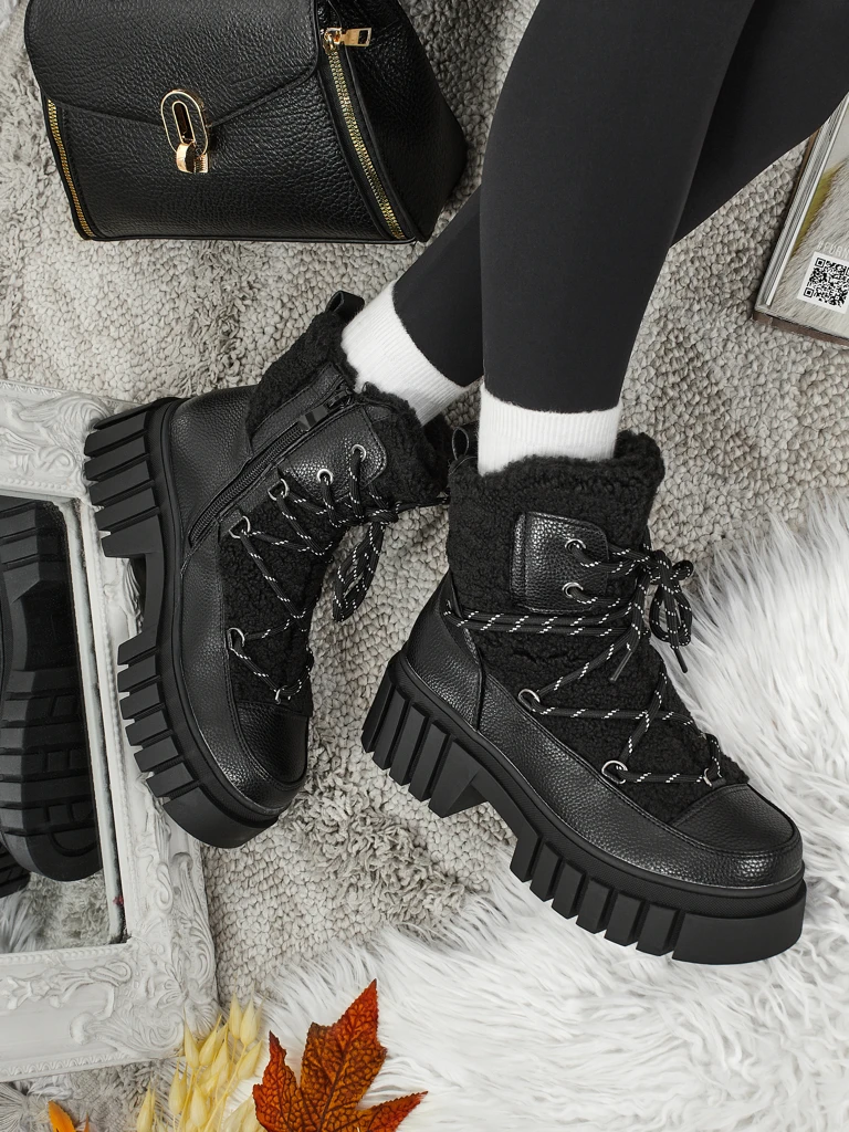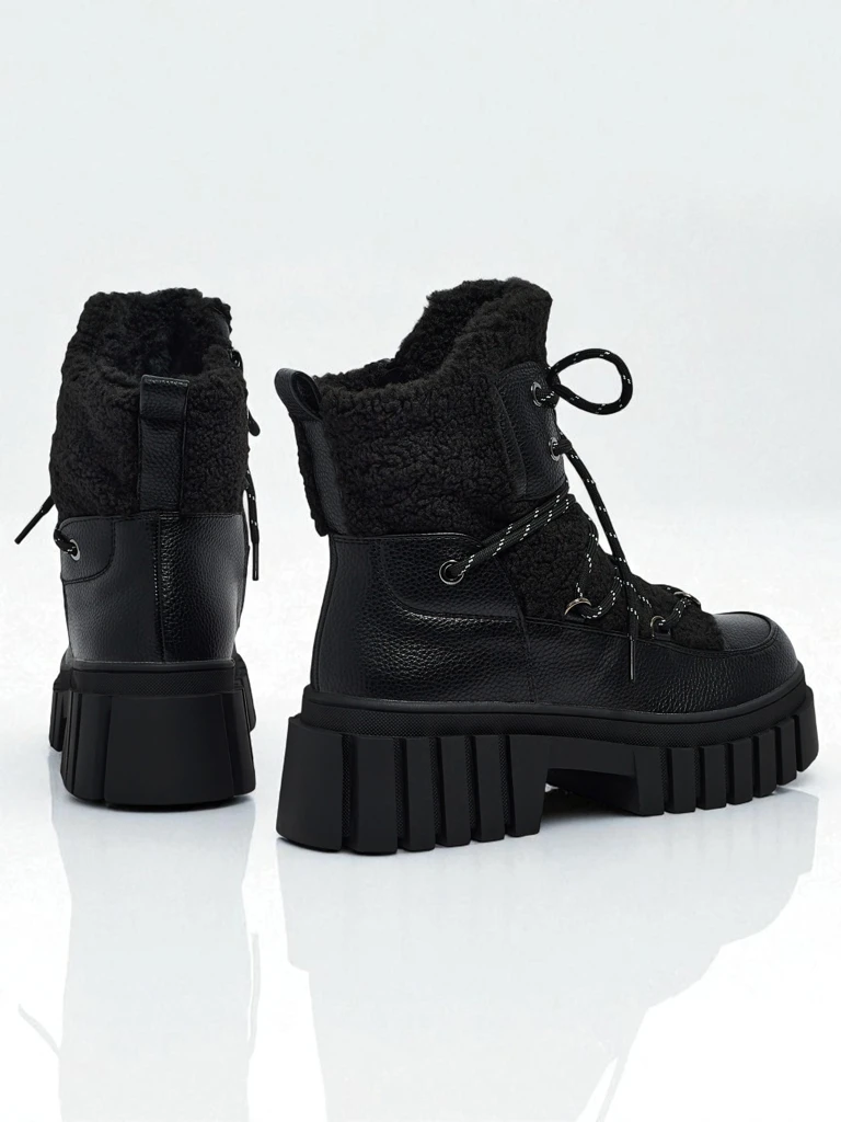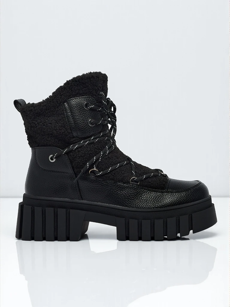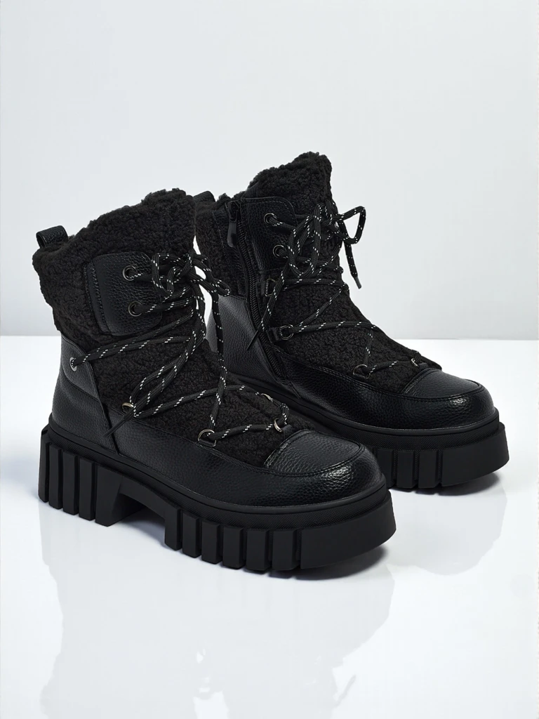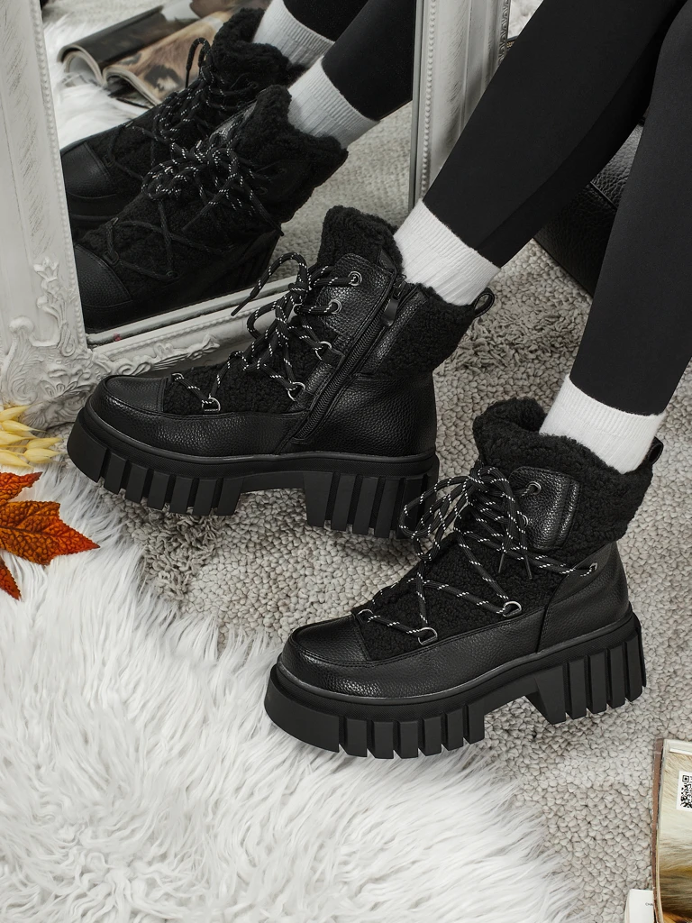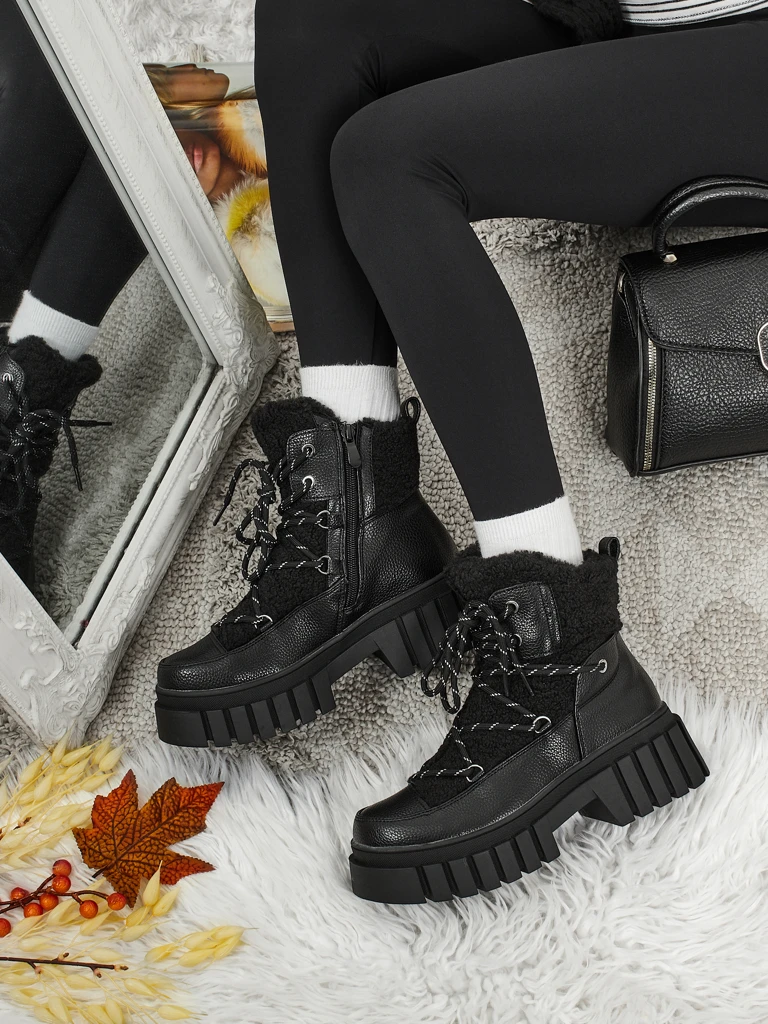 - Високи дамски боти тип workeri, изработени от еко кожа, с връзки и цип. Моделът е с равна подметка и деликатна подплата от изкуствен косъм. Идеален избор за по-студено време!
