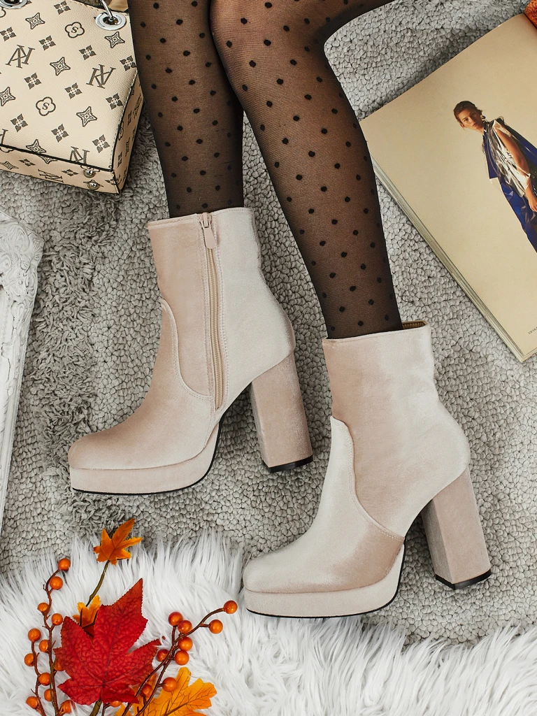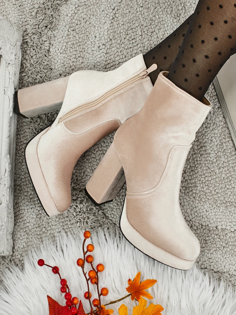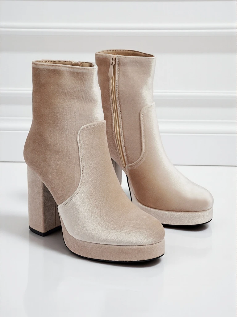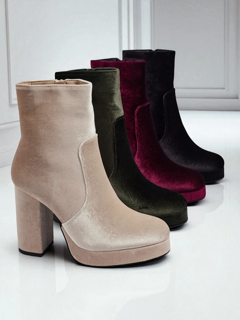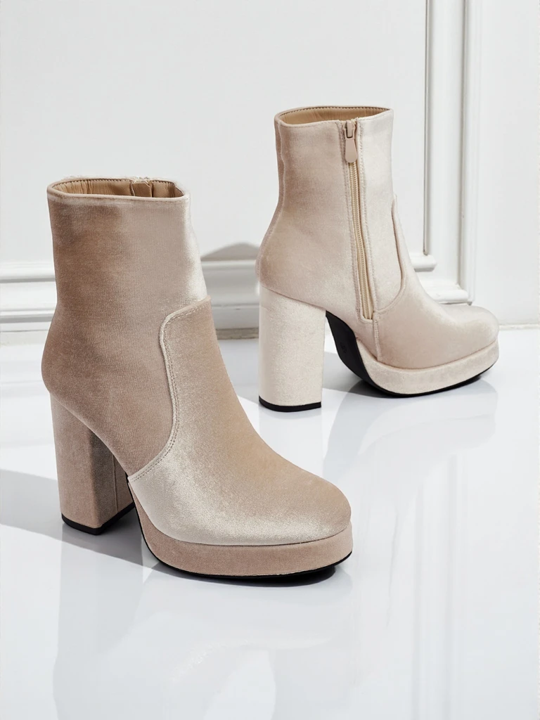 - Удобни боти на ток, изработени от плат, наподобяващ велур. Моделът се закопчава с цип. Има деликатна изолация под формата на козина. Перфектен избор за есента!