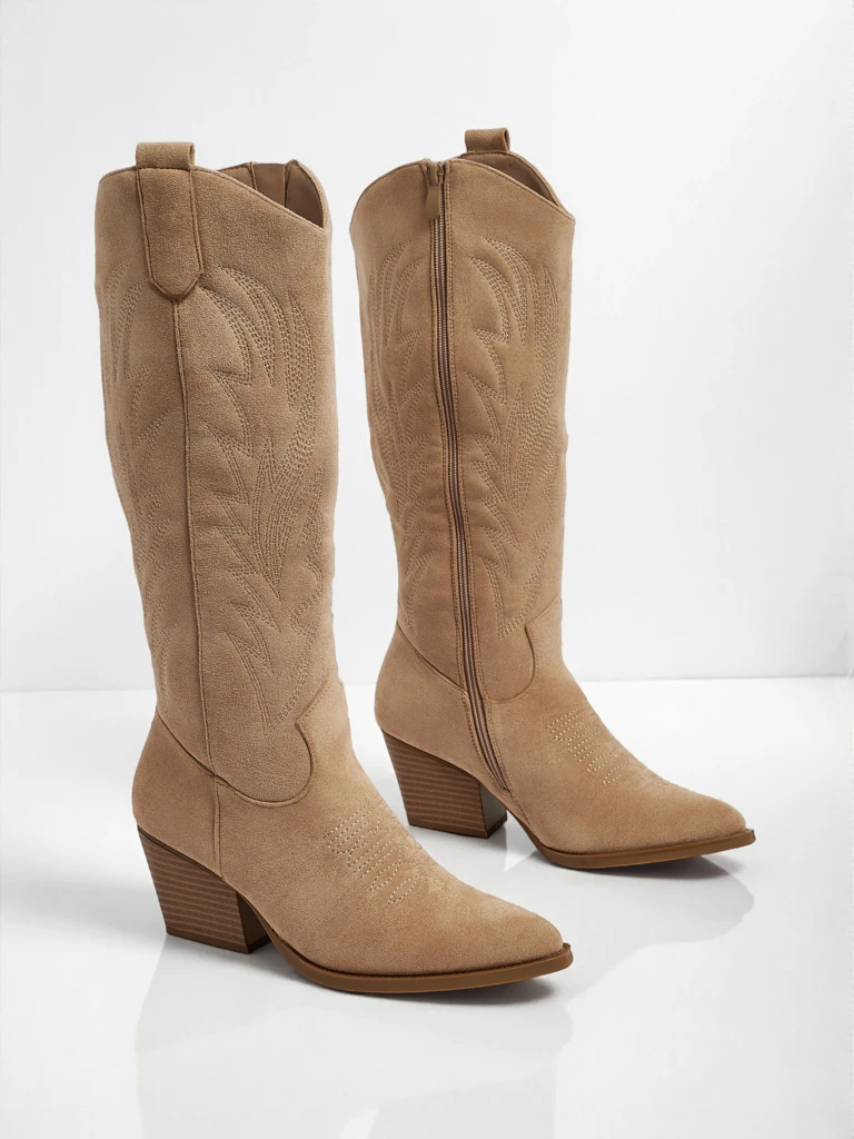 - Дамски ботуши в стил каубойки на ток, изработени от екологична велурена кожа. Обувките се закопчават с цип и имат текстилна подплата. Подходящи са за много дамски стилове!