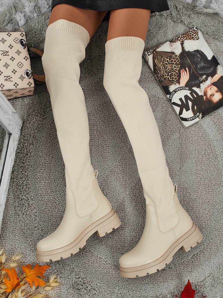 - Стилни дамски ботуши над коляното на равна подметка. Горната част е изработена от еластична текстилна материя с вложки от еко кожа, а вътрешността е с текстилна подплата. Моделът е тип „слип-он“. Идеални за ежедневни есенни тоалети!