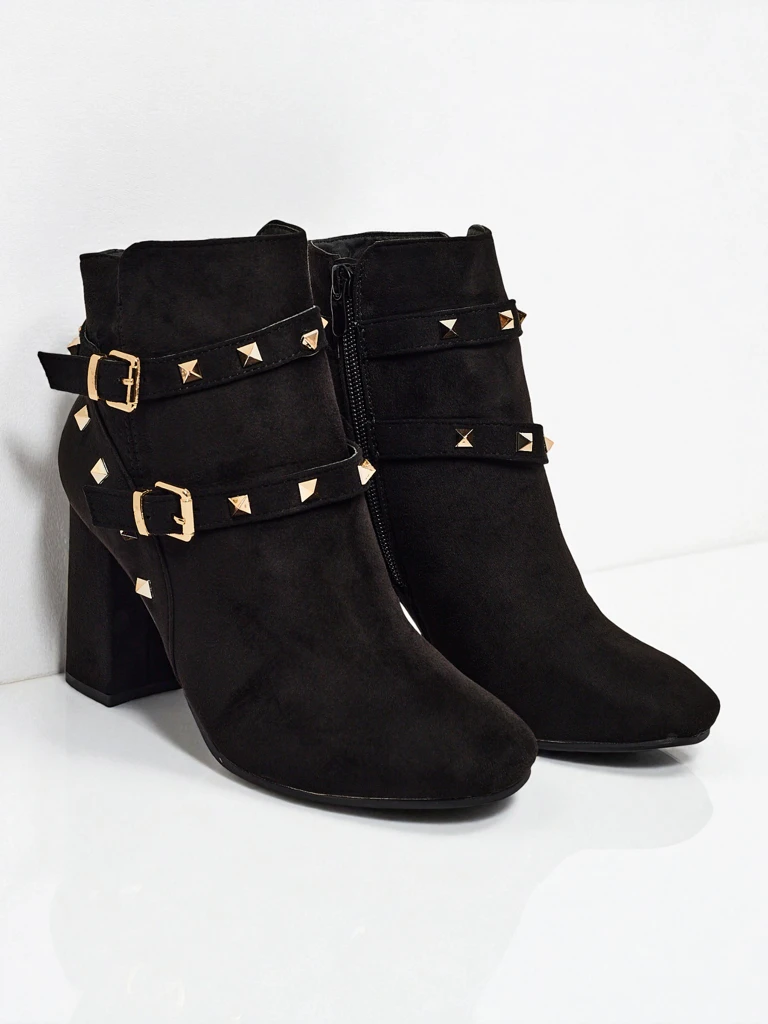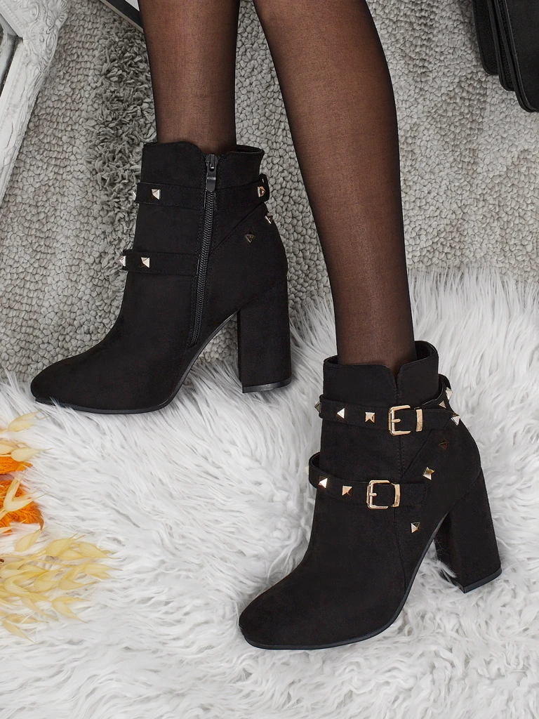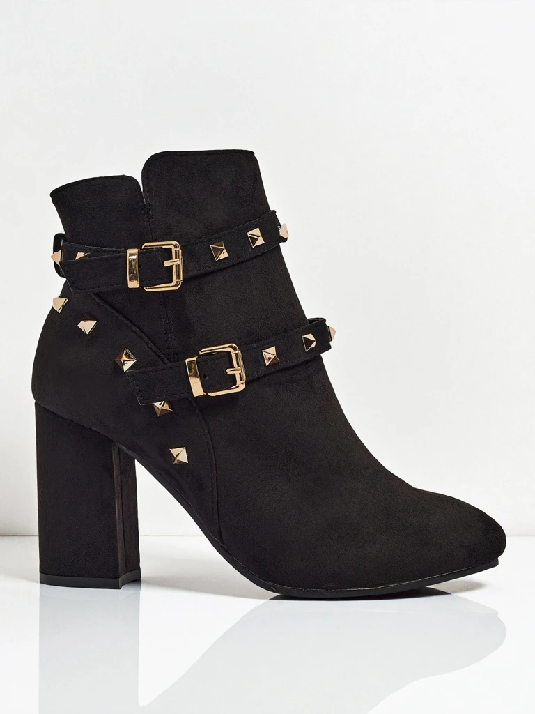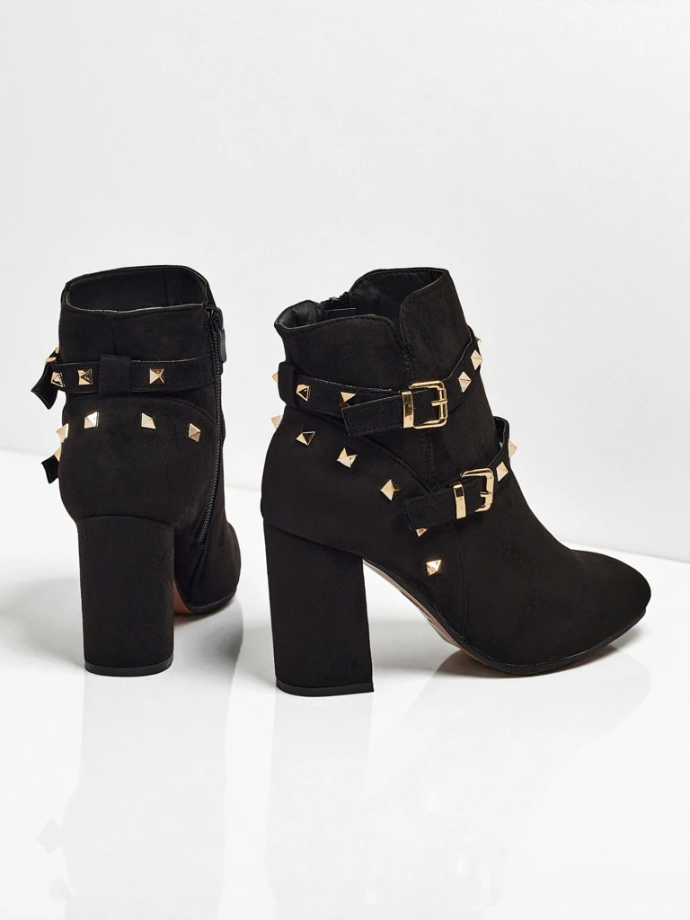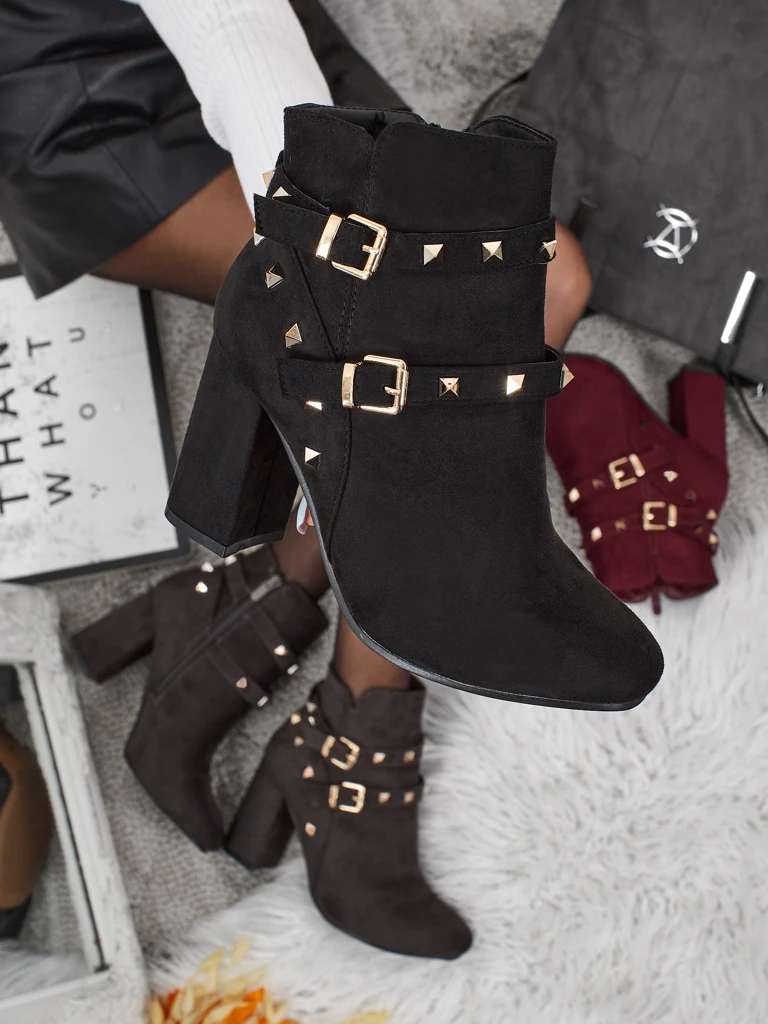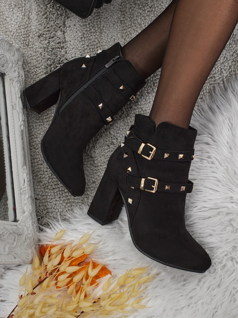 Характерен елемент са златните детайли под формата на катарами и нитове, които придават на ботите леко пънкарски характер. Токът с височина 9 см осигурява стабилност и комфорт при носене, а ципът отзад улеснява обуването и събуването.