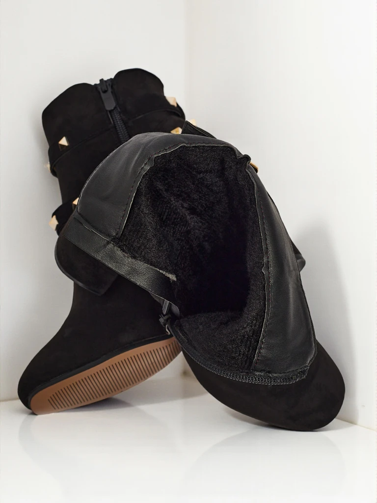 - Удобни боти на ток, изработени от еко велур. Моделът се закопчава с цип. Моделът е с деликатна подплата от пух и декоративни ленти с камъчета на горната част. Перфектен избор за есента!