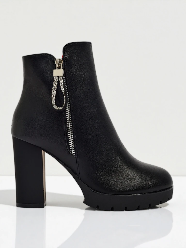 - Удобни боти до глезена на ток, изработени от еко кожа. Моделът се закопчава с цип. Моделът е леко подплатен с пухкава подплата и има декоративен цип с цирконии. Перфектен избор за есента!