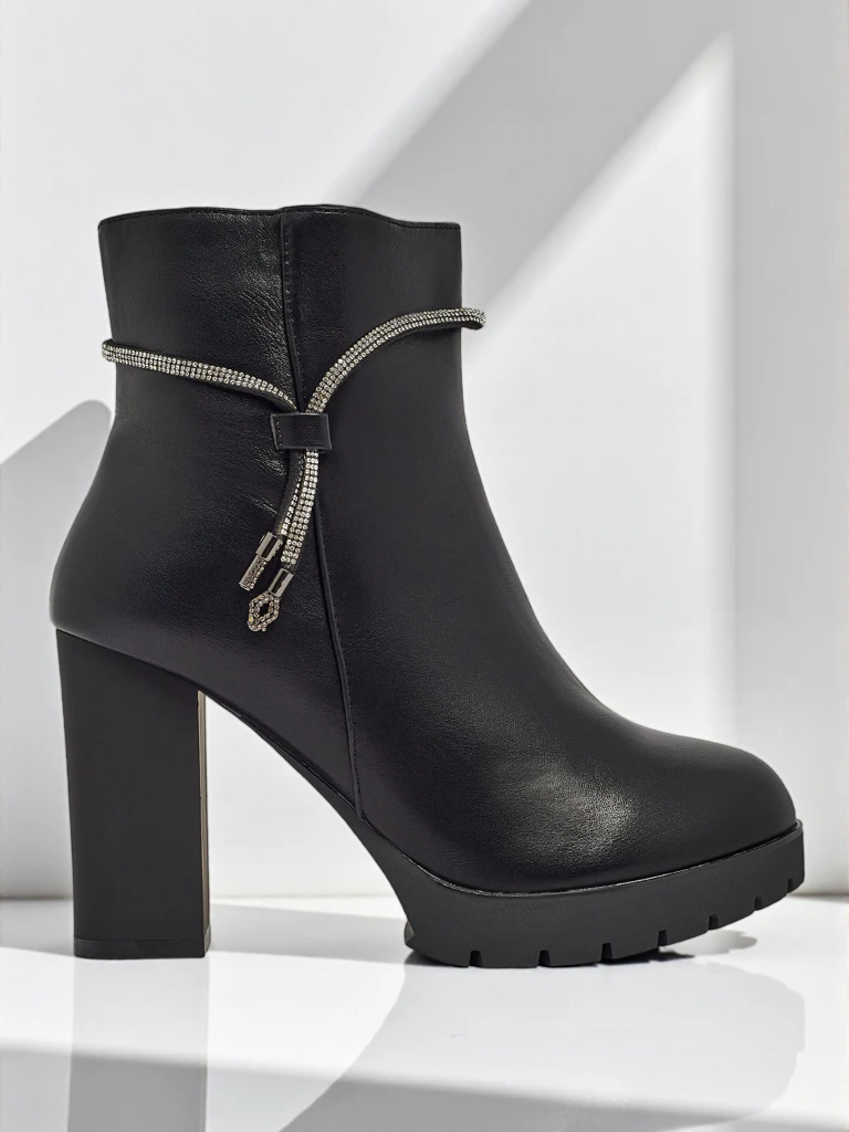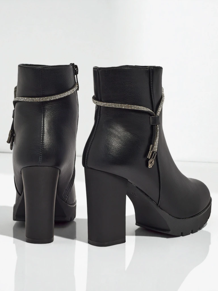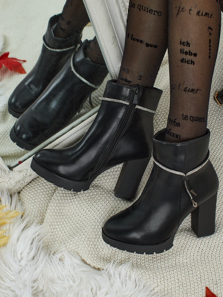 - Удобни боти до глезена на ток, изработени от еко кожа. Моделът се закопчава с цип. Моделът е леко подплатен с пухкава подплата и има декоративен цип с цирконии. Перфектен избор за есента!