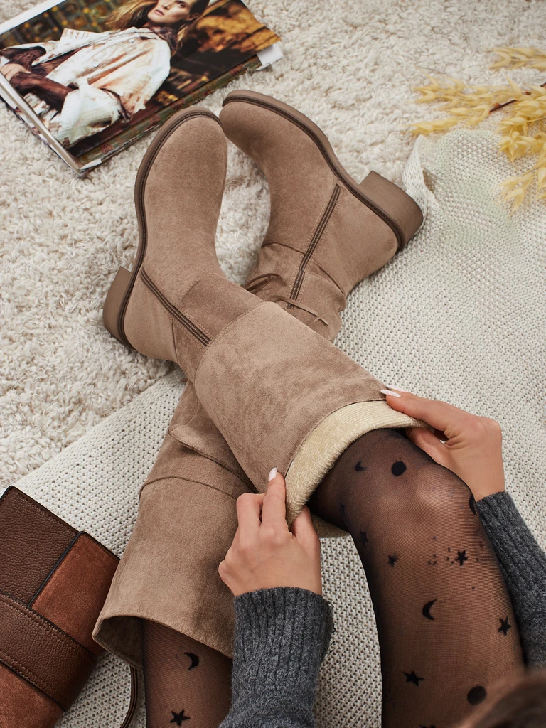 - Модерни дамски ботуши над коляното на нисък ток. Горната част е изработена от еко велур. Вътрешността е покрита с деликатен пух. Моделът осигурява комфорт и удобство в по-студените дни. Моделът се закопчава с цип до средата на прасеца.