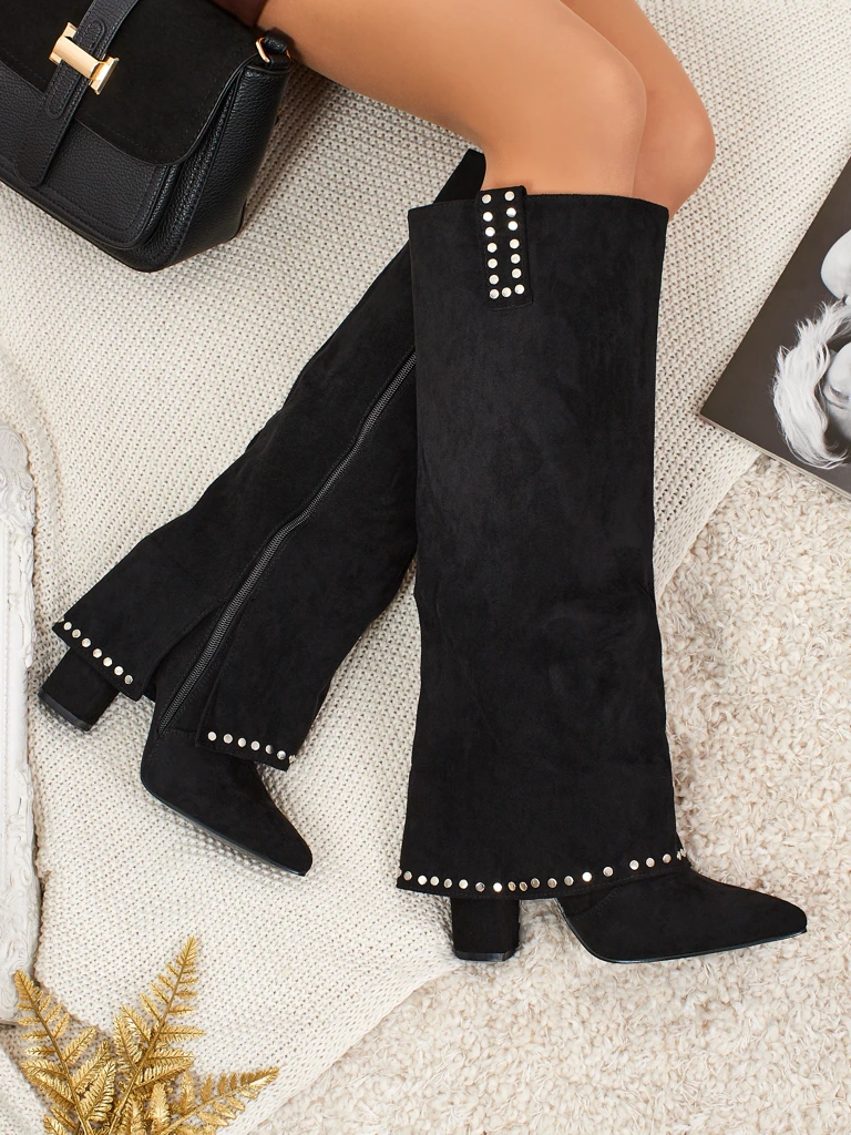 - Дамски ботуши на ток, с остър връх, изработени от екологична велурена кожа и допълнителна, декоративна горна част с камъчета. Обувките се закопчават с цип, с топла подплата отвътре. Подходящи са за много дамски стилове!