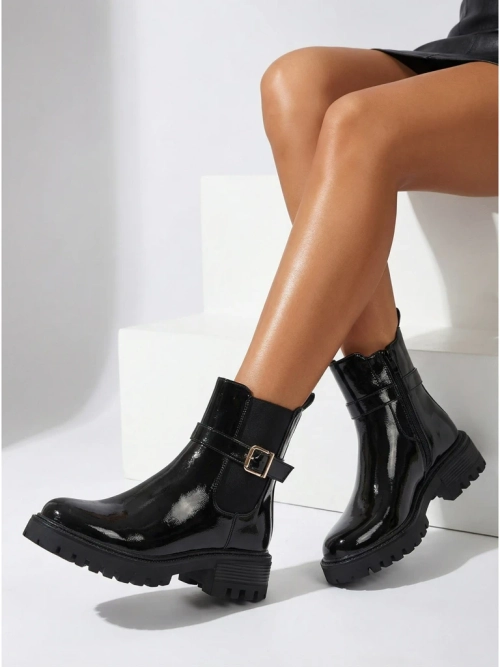 - Дамски боти с цип. Моделът е изработен от екологична лакирана кожа, с равна подметка. Има подплата, наподобяваща пух. Удобни и стилни, идеални за есента!