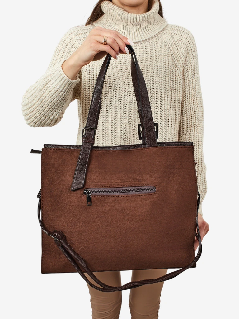 - Елегантна дамска чанта от екологична велурена кожа. 1 отделение с преграда, 4 джобчета, откачаща се, регулируема презрамка. Идеална за работа и за всеки ден – вместителна, модерна и практична.