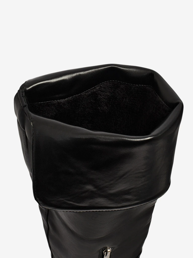 - Модерни дамски ботуши над коляното с по-дебела подметка. Горната част е изработена от еко кожа. Вътрешността е затоплена с деликатен пух. Моделът осигурява комфорт и удобство в по-студените дни. Моделът се закопчава с цип до средата на прасеца.